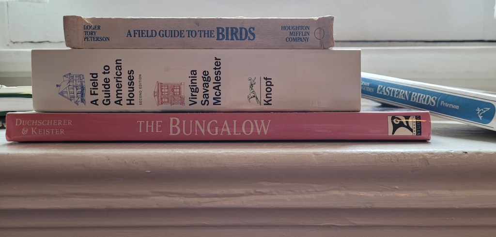 In 1984, Virginia and Lee McAlester published “A Field Guide to American Houses.” I have a 2002 updated copy that is 499 pages long, not counting the “for further reference” section, photo credits and the index. In 2013, Virginia McAlester published an edition that included sections on neighborhood development. She extended her coverage of house types to the 21st Century. My 2022 copy is 848 pages long, including references, acknowledgements and the index. This is truly the definitive resource for house watchers! However, like Roger Tory Peterson’s birding field guides, this book will not fit into a pocket and will certainly weigh down a backpack!